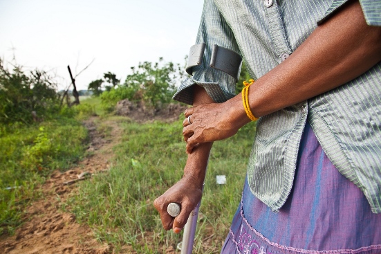 We got this land from Sri TELO and the house from IOM. We have a problem with flooding. We are being offered land where we used to be, but I need to be here to treat my foot. There are better services in Vavuniya. Here, I get transport to hospital for my treatment from the Church. Now we live with a few Muslim and Sinhala families. We live well together.